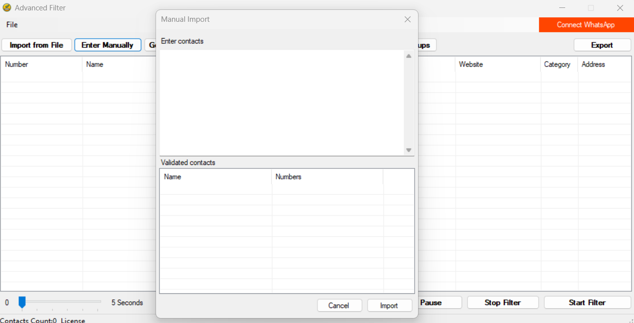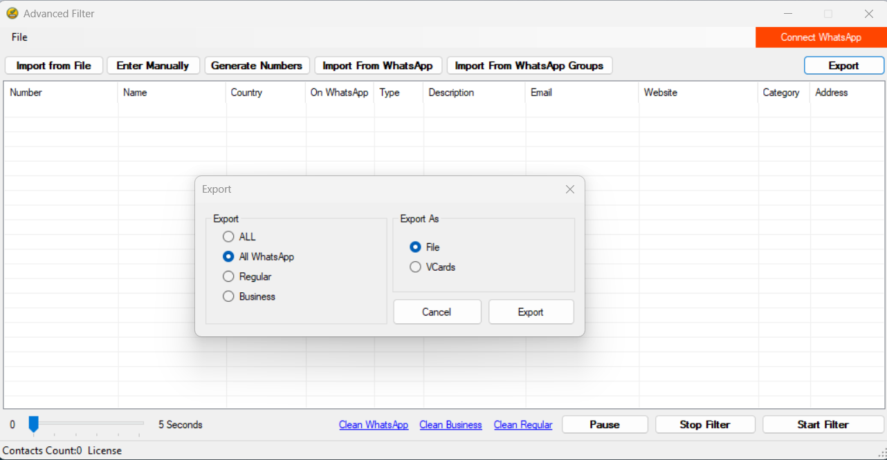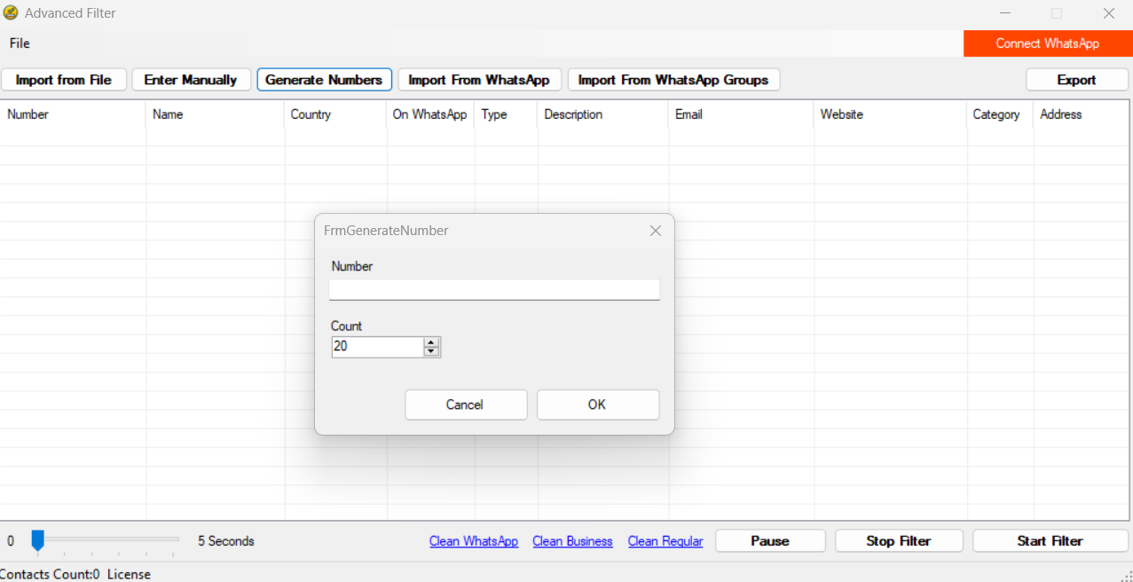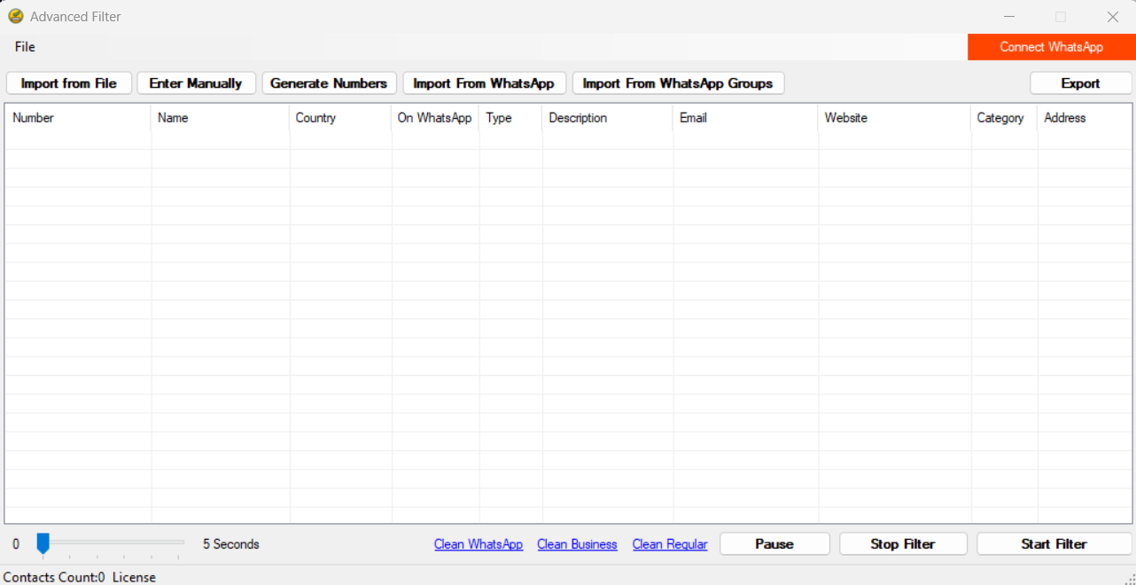 if you have numbers in bulk quantity and you want to know whatsapp and none whatsapp number so you can use advance whtsapp filter.
