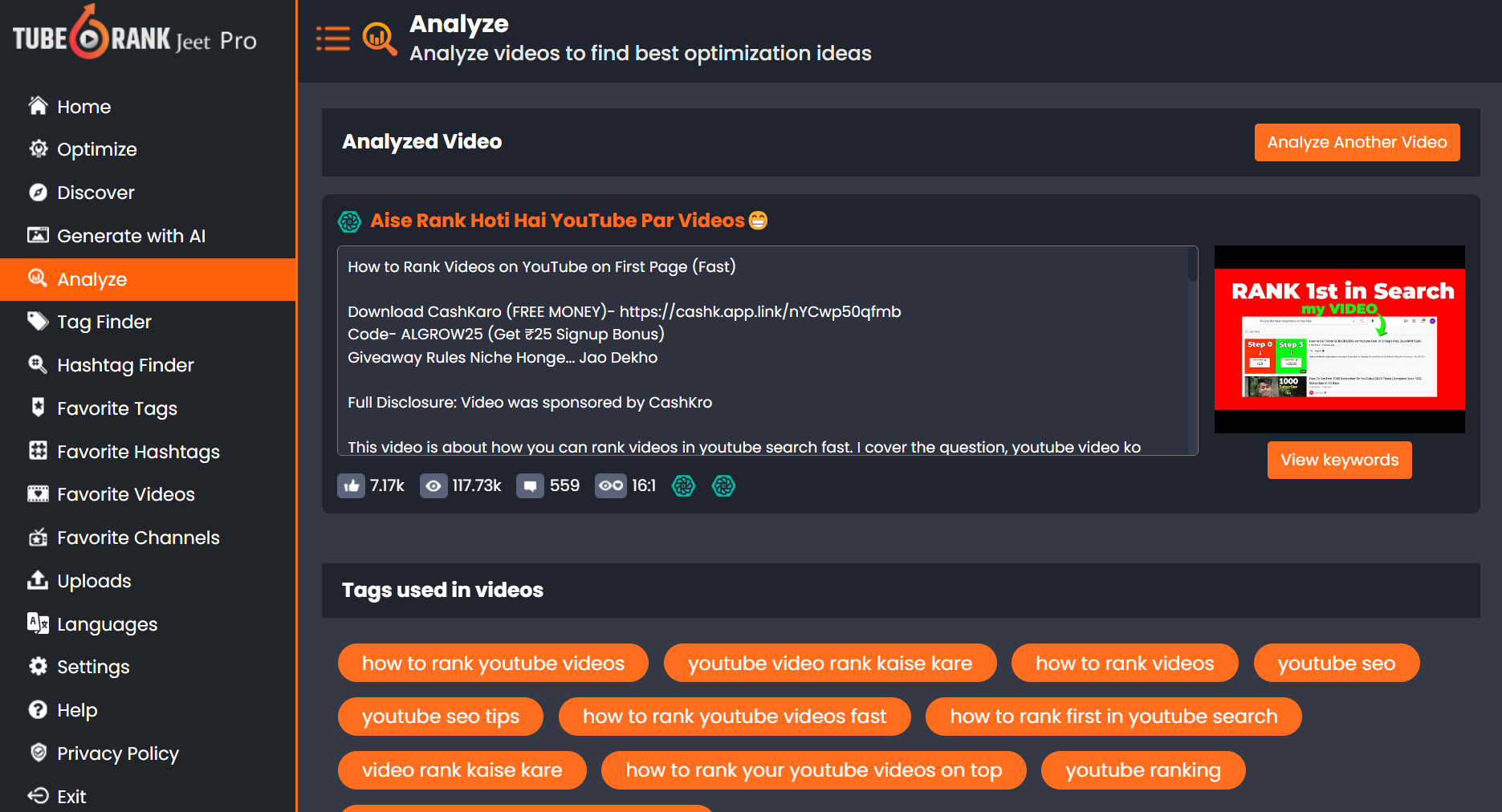 If you are a youtuber and you want to rank your youtube channel video so you can use this tool its tool are very usefull for youtuber you can analyze video and find out best keyword, tags and hashtag etc.
